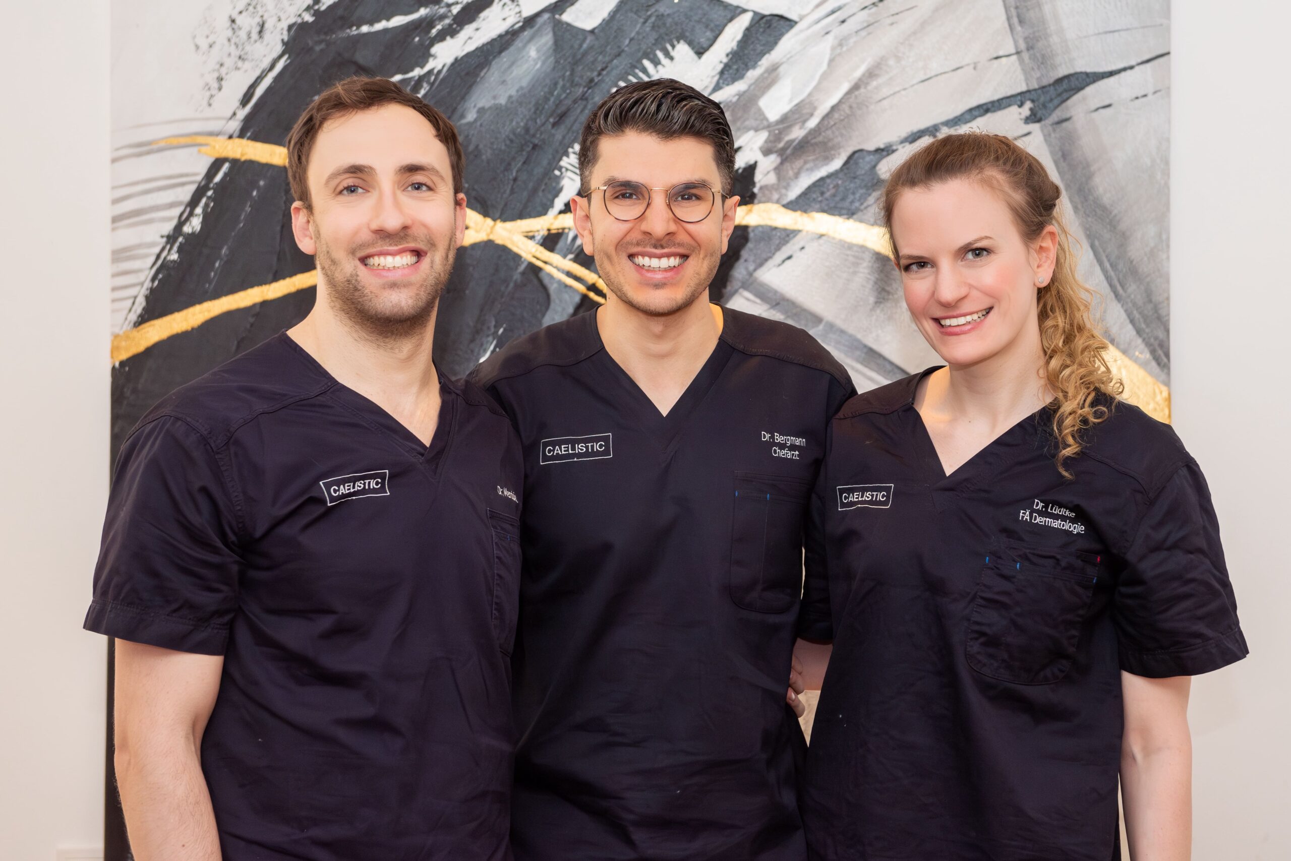 Arzt in CAELISTIC-Kleidung mit freundlichem Lächeln, Hintergrund mit ästhetischen Elementen, symbolisiert professionelle Beratung zu ästhetischen Behandlungen wie Botox und Hyaluron.